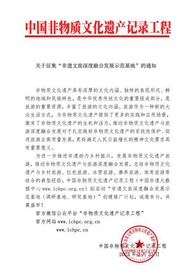 为进一步推进非遗助力乡村振兴,发展非物质文化遗产旅游,推动非物质文化遗产与旅游深度融合发展,总结非物质文化遗产与乡村旅游、红色旅游、冰雪旅游、康养旅游、体育旅游等结合的典型经验,中国非物质文化遗产记录工程(中国非遗大数据中心www.ichpc.org.cn)拟启动“非遗文旅深度融合发展示范基地(调研基地、研究基地)”创建推广计划,诚邀参与,共襄盛举!